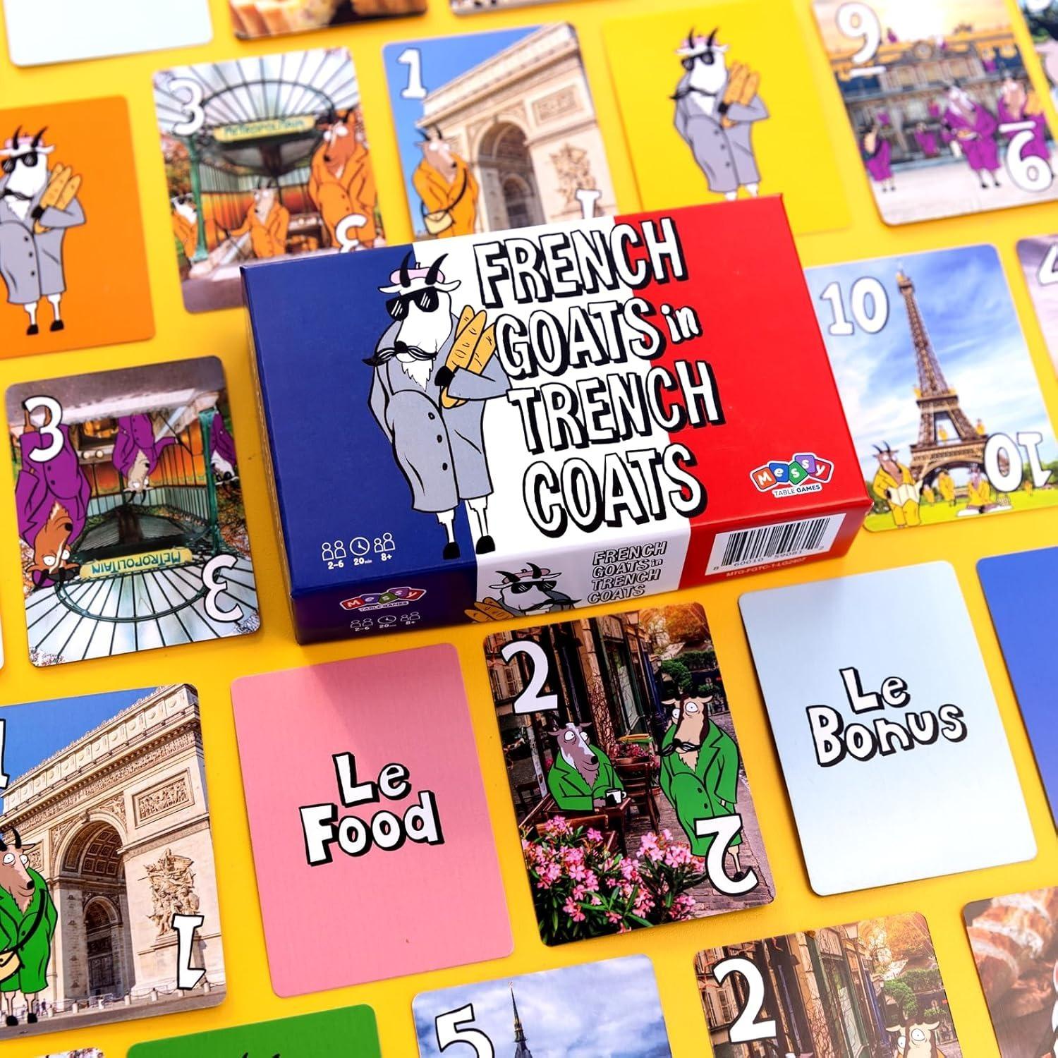 In this exciting trick-taking game, players bid against each other to win LE food cards. The player with the most LE food points at the end of the game wins!Each round, players decide what to bid. The highest bid wins the food. But, if there is a tie, the next highest bid wins! Each bidding card can only be played once per round. There are also special LE Bonus cards that can turn defeat into triumphant victory!The best strategy isn't always a high bid on everyone. What will the other players bid? What should you bid? French Goats in Raincoats is a fun, fast-playing game where you must outsmart your opponents to outbid them!*Features:** 2–6 Players* 15mins* Ages 8+