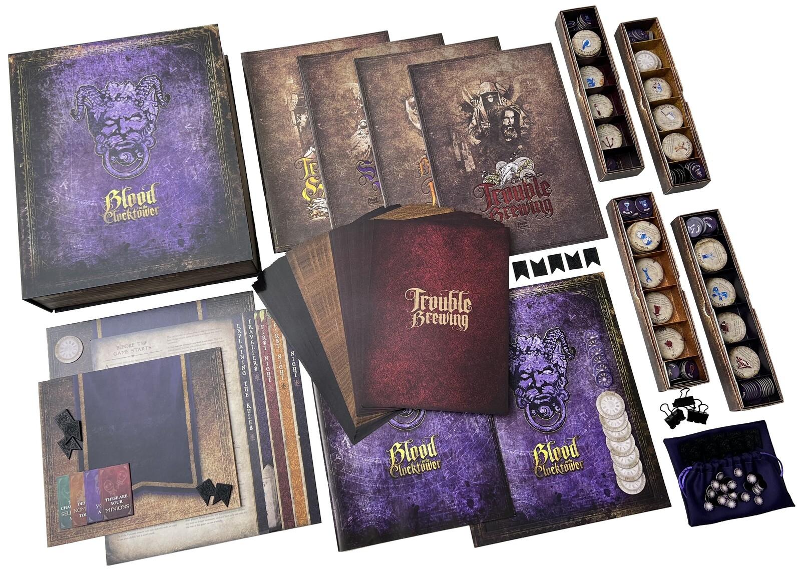 In the quiet village of Ravenswood Bluff, ‌a demon walks amongst you…During a hellish thunderstorm, on the stroke of midnight, there echoes a bone-chilling scream. The townsfolk rush to investigate and find the town storyteller murdered, their body impaled on the hands of the clocktower, blood dripping onto the cobblestones below. A Demon is on the loose, murdering by night and disguised in human form by day. Some have scraps of information. Others have abilities that fight the evil or protect the innocent. But the Demon and its evil minions are spreading lies to confuse and breed suspicion. Will the good townsfolk put the puzzle together in time to execute the true demon and save themselves? Or will evil overrun this once peaceful village?Blood on the Clocktower is a bluffing game enjoyed by 5 to 20 players on opposing teams of Good and Evil, overseen by a Storyteller player who conducts the action and makes crucial decisions. The goal of the game is to successfully deduce and execute the demons before they outnumber the townfolk. During a ‘day’ phase players socialize openly and whisper privately to trade knowledge or spread lies, culminating in a player's execution if a majority suspects them of being Evil. Of a ‘night’ time, players close their eyes and are woken one at a time by the Storyteller to gather information, spread mischief, or kill. The Storyteller uses the game's intricate playing pieces to guide each game, leaving others free to play without a table or board. Players stay in the thick of the action to the very end even if their characters are killed, haunting Ravenswood Bluff as ghosts trying to win from beyond the grave. If you arrive late to a game, you can enter after it's started as a powerful Traveller character with unusual talents and questionable allegiances. Each character comes with their own special ability and no two players in a game are ever the same character.*Awards & Honors:** 2022 Golden Geek Most Innovative Board Game Nominee* 2022 Golden Geek Medium Game of the Year Nominee* 2022 Golden Geek Best Thematic Board Game Nominee* 2022 Golden Geek Best Party Game Nominee* 2022 Golden Geek Best Board Game Artwork & Presentation Nominee*Features:** 5–20 Players* 30–120mins* Ages 15+
