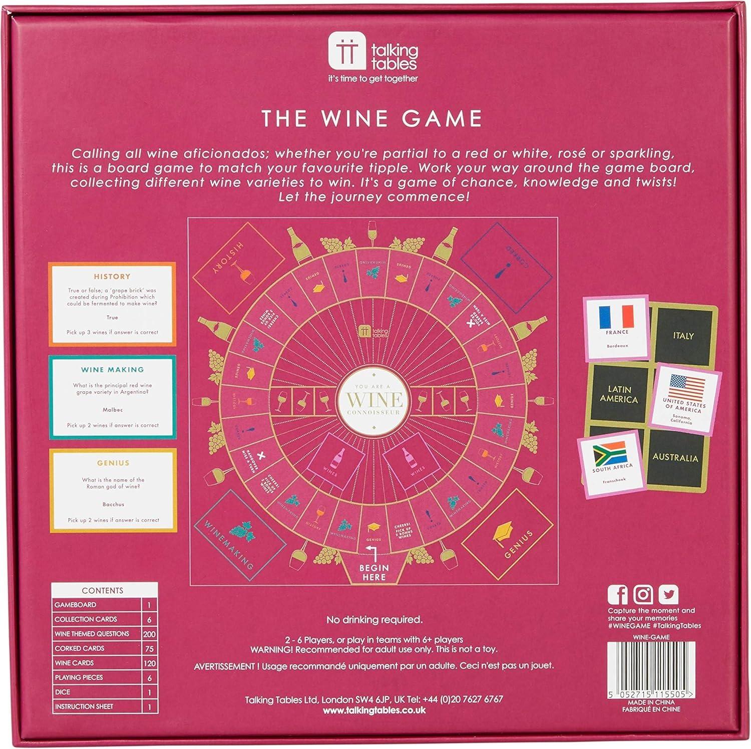 Calling all wine aficionados; whether you’re partial to a red or white, rose or sparkling, this is a board game to match your favourite tipple!Answer wine trivia questions correctly to work your way around the game board, collecting different wine varieties to win. It's a game of chance, knowledge and twists! The ultimate board game for wine lovers and a perfect dinner party table game. It also makes a great gift for wine lovers.Contents include:1× Instructions Booklet1× Gameboard6× Collection Cards200× Wine Themed Questions120× Wine Cards75× Corked Cards6× Playing Pieces1× Dice*Features:** 2–6 Players (6+ Players if playing in teams)* Ages 18+_Drinking Not Required to play!_