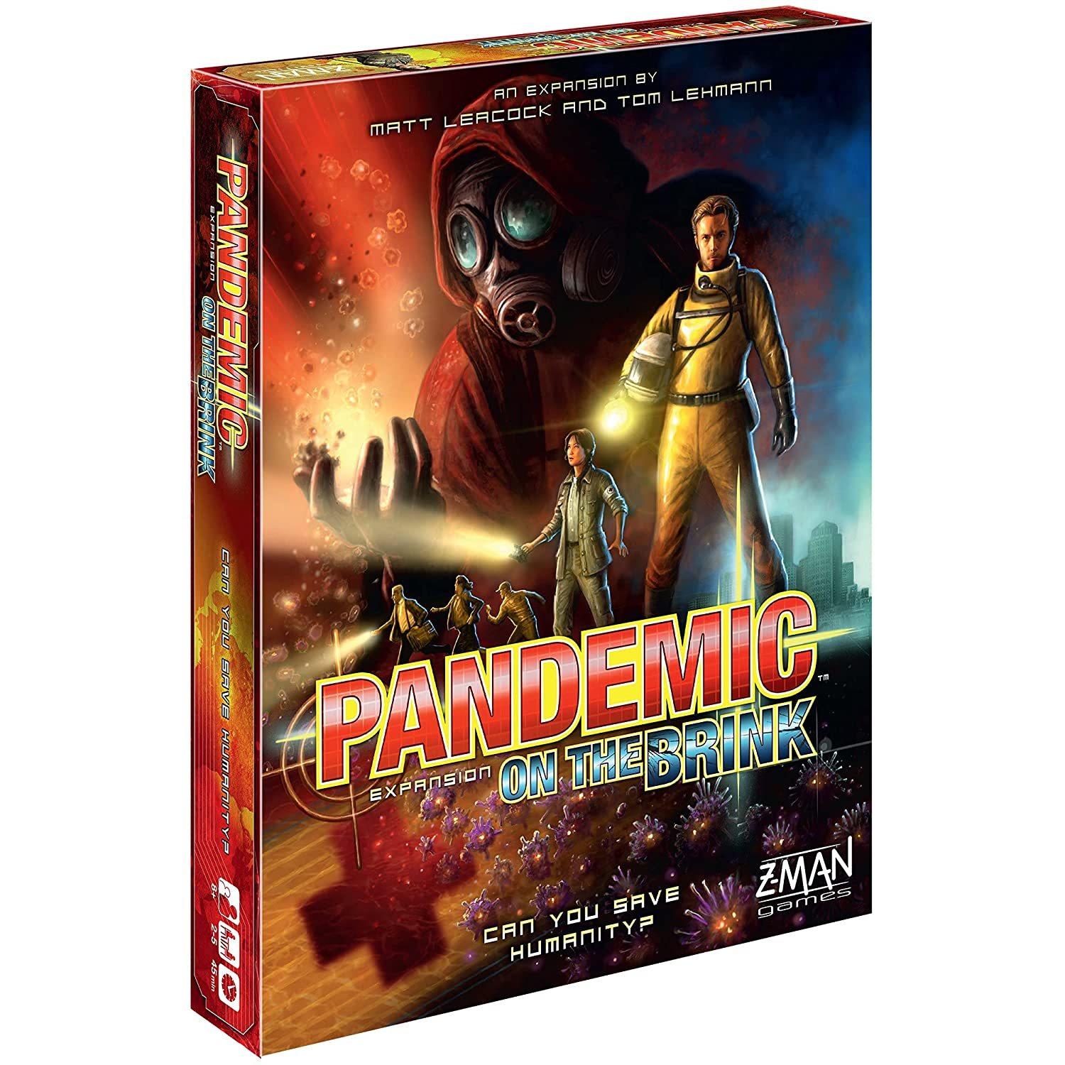 *Pandemic is required to enjoy this game*Pandemic: …ame/21325823*Unexpected Evolution*You’ve found the cures to four deadly diseases. But what happens when those diseases get stronger? Worse yet, what happens when someone spreads them intentionally?! Return to the world of Pandemic with On the Brink and prepare for the unexpected. The three challenges included with this expansion evolve the base game mechanics in exciting ways. One disease might become a Virulent Strain and become more difficult to treat as the game goes on. Or you could introduce an unpredictable fifth disease with the Mutation challenge and watch it pop up in unexpected places. Finally, teamwork is even more important if a fifth player dons the mask of the Bio-Terrorist and spreads panic while moving secretly across the board. Try each challenge individually or combine them all for a major test!*Another Day on the Job*On the Brink also includes more of what made Pandemic an instant classic. With seven new roles and eight new event cards, the expansion injects even more variety into your globe-trotting adventures. Anticipate upcoming infections as the Troubleshooter or save the day with the extra actions granted by a clutch Borrowed Time. Combined with the base game, these cards open new avenues for experimentation and improvisation in your quest to save humanity. And if finding cures is becoming routine even on the Heroic difficulty, you can always add the Epidemic card and tackle Legendary difficulty. With a whopping seven Epidemic cards, playing at Legendary will challenge even the most experienced Pandemic players. The stakes have been raised. Now rise to the occasion and save humanity.*Contents*Rulebook, 7 Role Cards, 7 Pawns, 8 Event Cards, 1 Epidemic Card, 1 Reference Card, 1 Cure Token, 1 Cure Indicator, 1 Cure Indicator Card, 12 Disease Cubes, 3 Mutation Event Cards, 2 Mutation Cards, 8 Virulent Strain Epidemic Cards, 5 Petri Dishes with Labels, 4 Blank Cards, 1 Bio-Terrorist Location Pad, 4 Blank Cards*The Dice Tower Seal of Excellence is a trademark of The Dice Tower, LLC and is used with permission.*