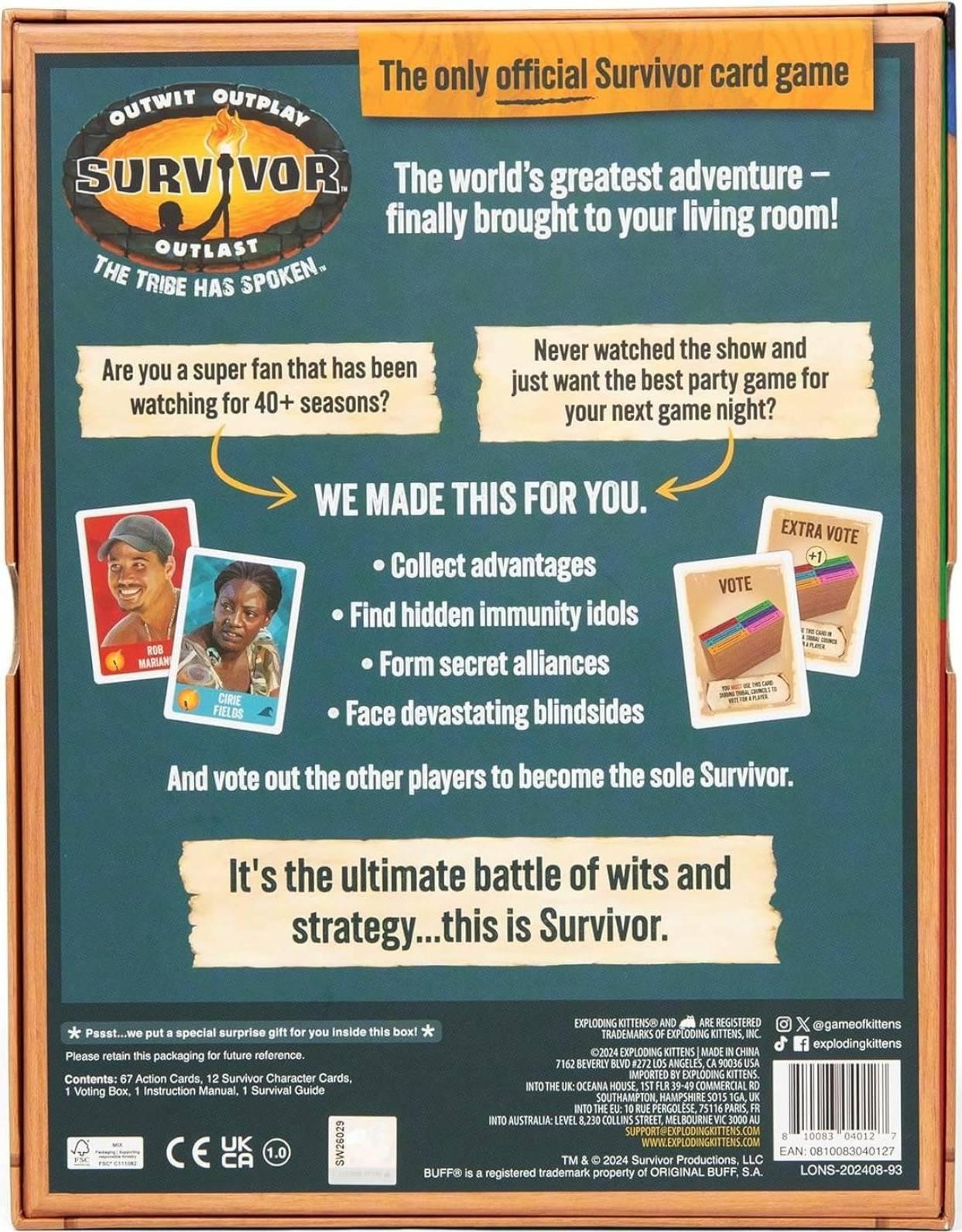 Survivor: The Tribe Has Spoken is meant to replicate the fun, drama, and excitement of the long-lived television reality show without you needing to sleep in the jungle or eat bugs. To survive, players must collect advantages, find hidden immunity idols, form secret alliances, and face devastating blindsides, while surviving Tribal Council eliminations, in which players decide who should be voted out by using the game box as a “voting urn” in which players secretly cast votes. Cards let you look at opponents' hands, steal cards, manipulate votes, declare yourself tribal council leader, protect you from elimination, and more.The last two players standing must make a case to all eliminated players as to why they deserve the title of “Sole Survivor”. The game includes player cards featuring memorable contestants from the 47 seasons of Survivor that have aired as of 2024.*Contents:** 67 Action Cards* 12 Survivor Character Cards* 1 Voting Box* 1 Instruction Manual* 1 Survival Guide*Features:** 3–6 Players* 30–60mins* Ages 8+