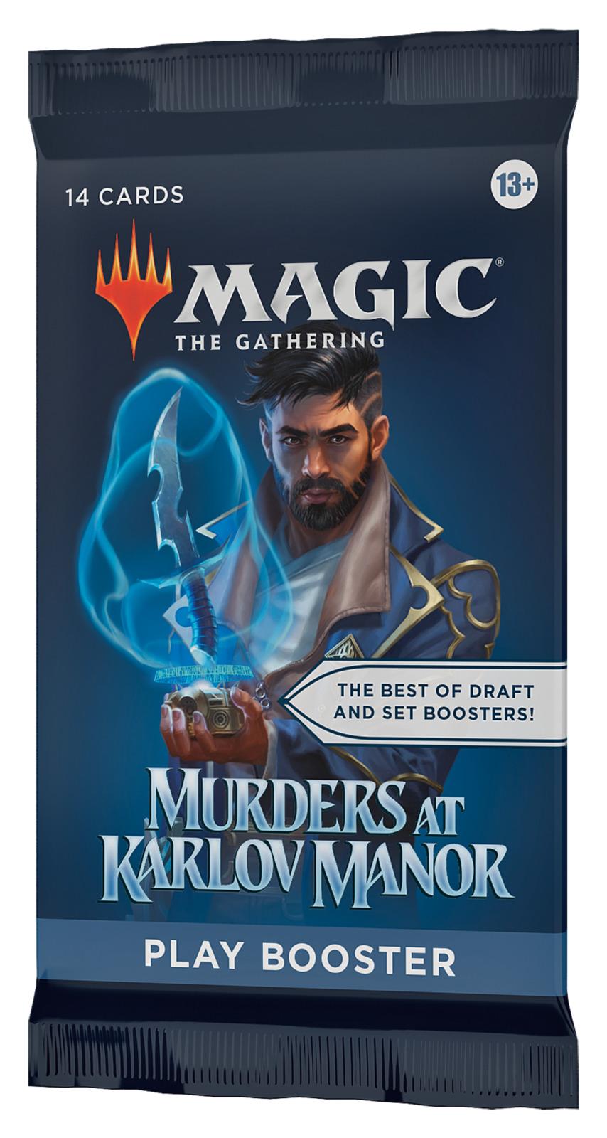 *_Magic The Gathering: Murders at Karlov Manor – Play Booster Pack_*Murder! Mystery! _Magic!_ A string of alarming murders streaks across the plane of Ravnica, and your players will step into the shoes of Ravnica's greatest detectives to track the clues and crack the case. Will they uncover the mastermind before it's too late?If solving one case isn't enough for your players, there are even more puzzles to be solved, woven into the Murders at Karlov Manor products. Let your players put their detective skills to the test!Collector Boosters are the place for your players to chase down Ravnica's killer cards! Known as the shortcut to the coolest cards in the set, each Collector Booster is packed with foils and special treatments that are sure to add flair to any player's collection. A full display of Collector Boosters helps players strategize in style.*Contents:** 15× Magic: The Gathering cardsCollector Booster-exclusive special treatments and 10–12 Traditional Foil cards in every pack.* 1× Traditional Foil double-sided token, with a combination of 5 cards of rarity Rare or higher, 3–5 Uncommon, 4–6 Common, and 1 Full-Art Land cards. Serialized Card in <1% of boosters.