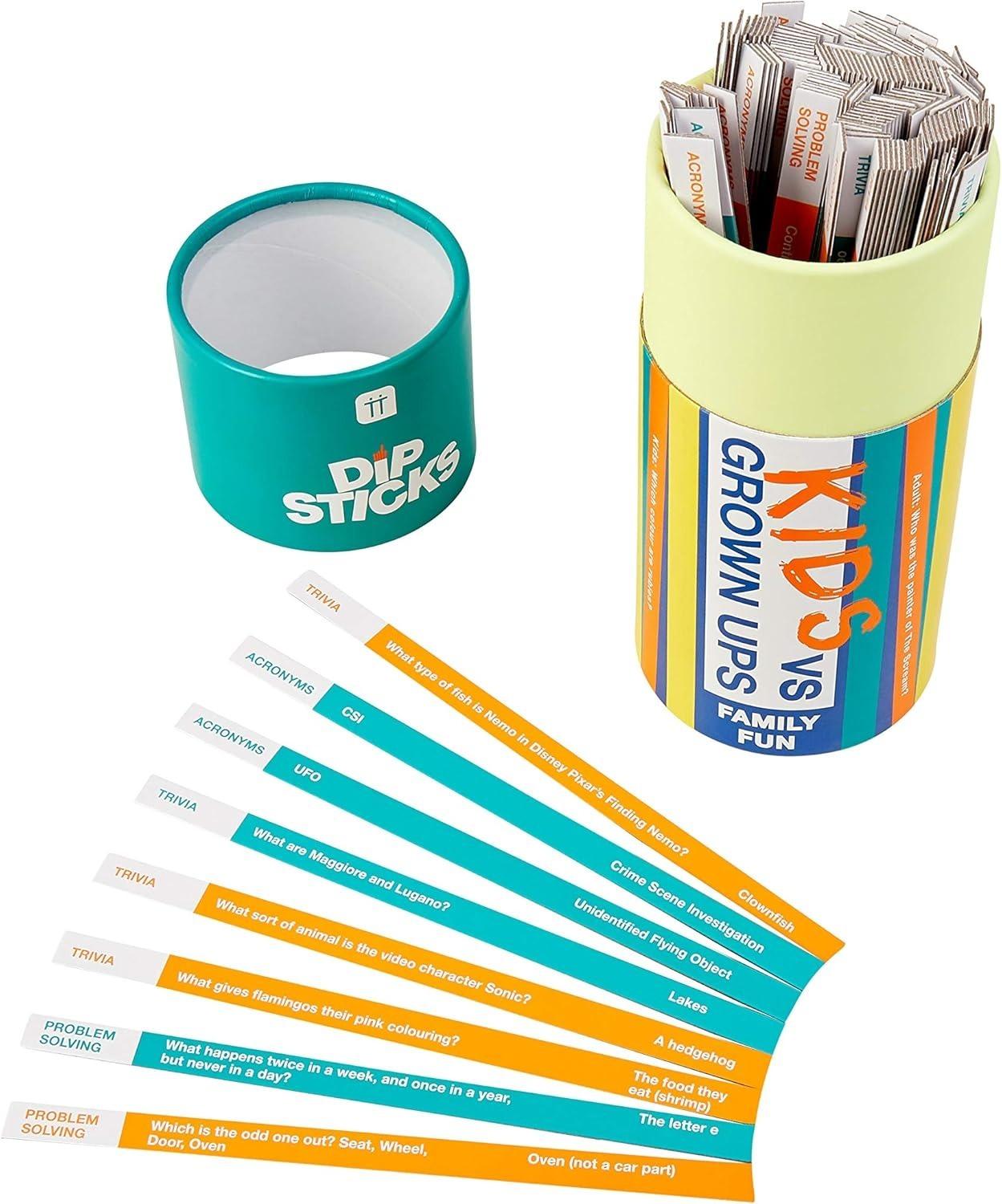 The Dipsticks Kids vs Grown Ups Game by Talking Tables. Dip in, pick a stick and let the battle commence!Each stick contains either a trivia question, acronym or problem-solving question with separate questions for the kids and adults. Read the orange side for the kid's question or flip over the stick to the blue side to reveal the trickier adult's question. Be the first person to answer correctly to win a stick – the person with the most sticks wins. This game is guaranteed fun for all the family and is sure to spark your inner competitor. Contains 160 double-sided sticks.*Features:** 2+ Players* Ages 10+
