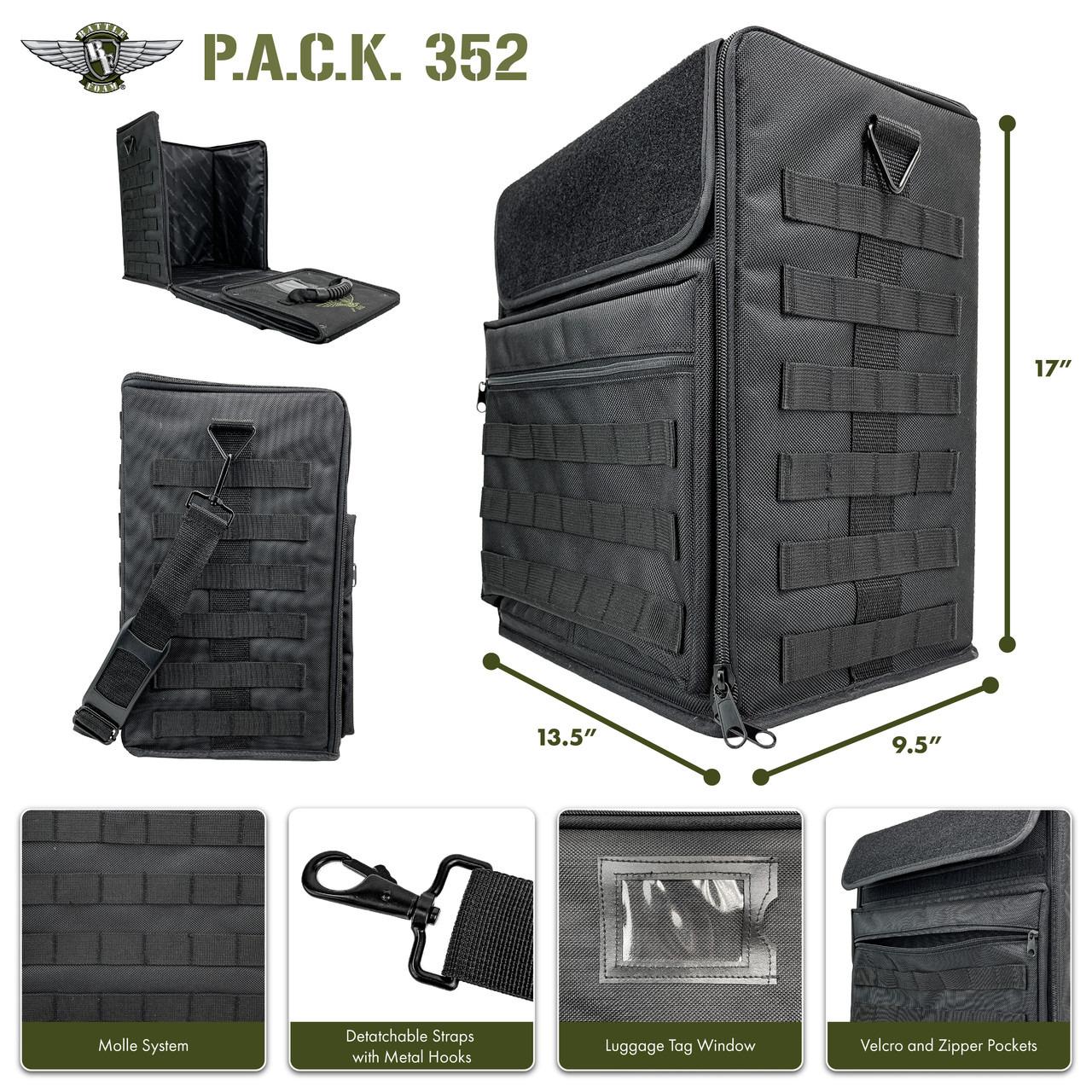 *Battlefoam: P.A.C.K. 352 – Magna Rack Load Out (Black)*The P.A.C.K. (Personal Army Combat Kit) 352 can fit 14.5 inches (368 mm) of Battle Foam Small (BFS) size foam trays (11.5W x 7.75L"). Its rugged, black Ballistic Nylon exterior protects a hard plastic interior built for strength and durability. This bag was designed for airport travel and meets all FAA regulations for carryon luggage. The P.A.C.K. 352 offers a molle system, which allows you to further customize this bag to fit your specific storage and transportation needs. Molle accessories offer storage solutions for tablets and other small books, dice and other gaming accessories as well as cell phones and other personal items. To view and/or purchase these accessories, click here. It also has two thin front pockets built into this bag that will hold papers and small/thin books.*Specifics:** Metal Sheet Dimensions – 9.125W x 6.5L" (232W x 165L mm)* Total Tray Dimensions – 11.5W x 7.75L x 0.625H" (292W x 196L x 16H mm)* Outside Bag Dimensions – 13.5W x 9.5L x 17H" (343W x 241L x 432H mm)*This kit includes:** 1× Small Magna Rack Original Tray.* 4× Small Magna Rack Slider Trays.* 12× 3 inch (76 mm) Magna Rack Spacer Legs.* 4× 2 inch (50 mm) short Magna Rack Spacer Legs.* 4× Top Plugs* 4× Bottom Plugs* 4× Top Caps*Please note:** Please note that one tray in this kit is static and does NOT slide out. All other trays will slide out for easy access.* Surface scratches may be visible on the metal. Please understand when purchasing you may not have a blemish free surface. This will not affect the functionality of the Magna Racks.