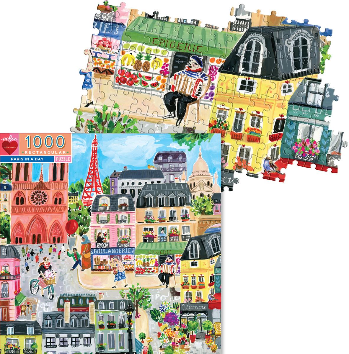 *eeBoo: Paris In A Day (1000pc Jigsaw)*Experience the enchanting allure of Paris in a single day with the eeBoo Paris in a Day jigsaw puzzle. Created by the talented artist Jennifer Orkin Lewis, this 1000-piece puzzle captures the essence of the City of Love. Measuring 28" x 21", it offers a challenging yet rewarding experience for puzzle enthusiasts aged 11 and above. Immerse yourself in the beauty of iconic Parisian landmarks and monuments as you piece together this captivating puzzle. Whether you're a seasoned traveler or simply dreaming of wandering the streets of Paris, this puzzle is the perfect way to indulge your wanderlust from the comfort of your own home.*Features:** A high-quality jigsaw puzzle for adults and families* With glossy, sturdy pieces and minimal puzzle dust* Made with recycled board and printed on FSC-certified paper.* Completed Dimensions – 28 × 21 inches.* Piece Count: 1000 glossy pieces.* Includes colour insert.*Suitable for ages 14 & up*