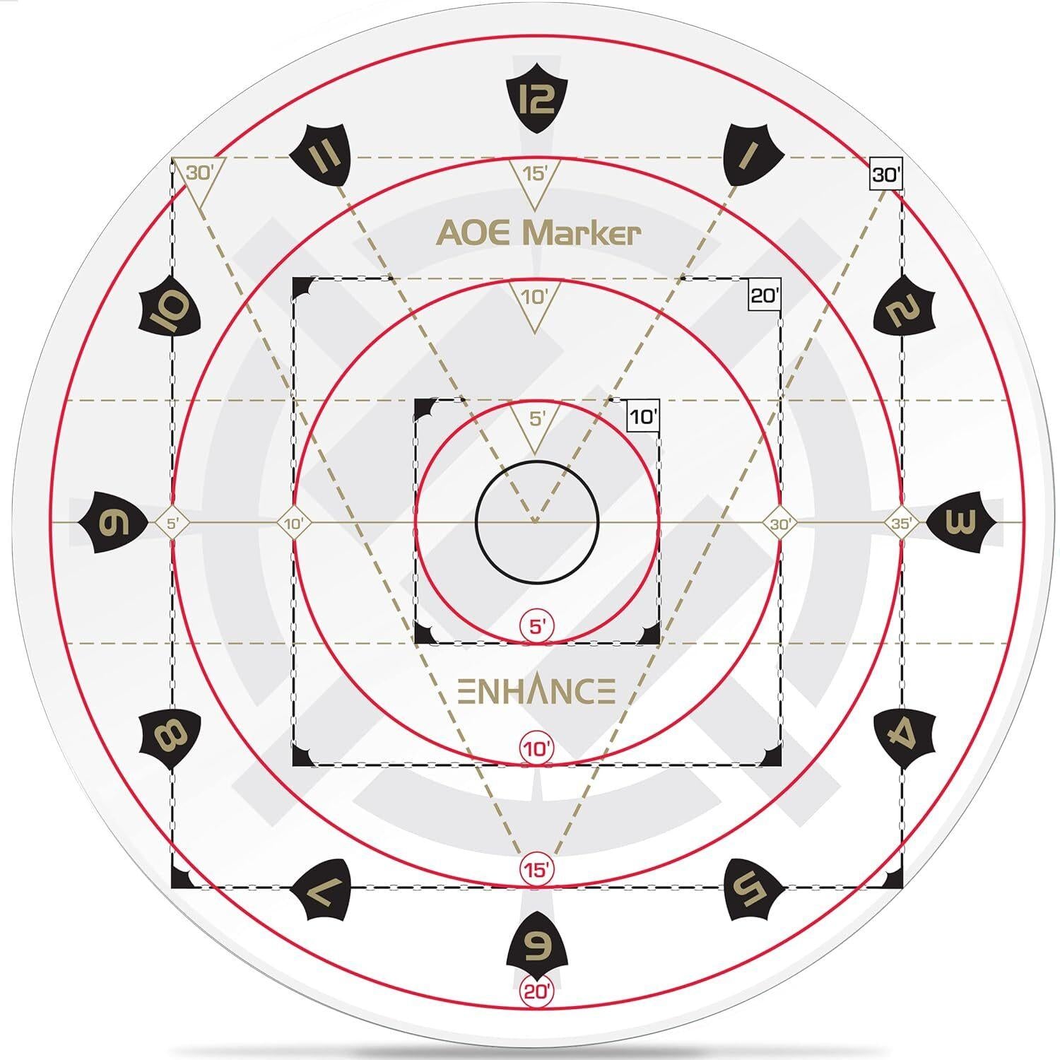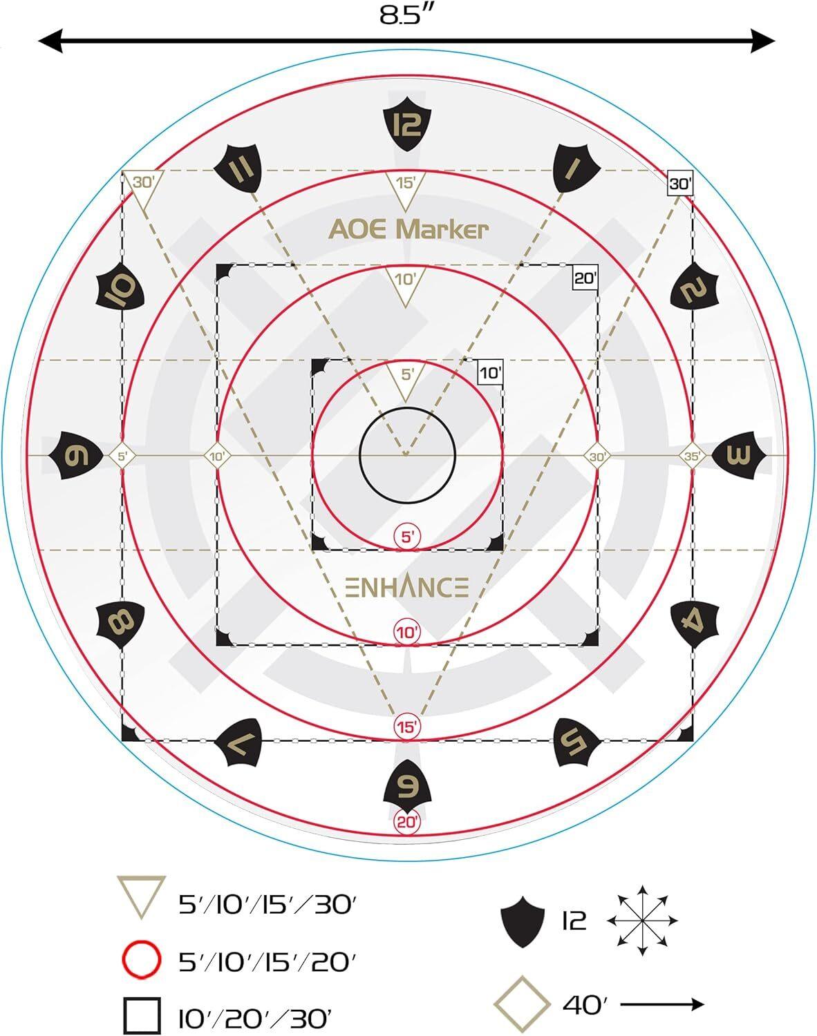 With 5 different and clearly labeled*Features:** An AoE spell template speeds up gameplay by easily & accurately visualizing the Area of Effect (AoE) for a spell, ability, or event in RPGs like DnD, Pathfinder, etc* Keep players immersed in the game by cutting down on technical time that would be wasted on digging out rule books to debate the size of AoE damage on gridded or grid-less play* Includes 40ft Distance Marker for precise character movement measurement on grid-less play, while 12 scatter markers (shield icons) enable randomized direction* The AoE template is accurately printed on clear acrylic with 1" scale designed for TTRPG grids; all markers and labels are clearly indicated for quick and practical use* Made of expertly cut acrylic that is 2X thicker than competitor options for superior sturdiness that will complement your arsenal of premium ENHANCE Tabletop Series accessories