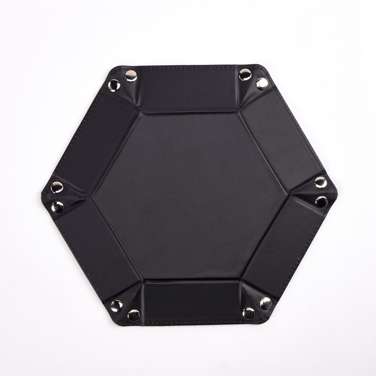 *_Hexagonal Velvet Dice Tray (Green)_*Introducing our sleek hexagonal dice tray, the perfect complement to any game night. This refined accessory is a must-have for tabletop enthusiasts who appreciate a touch of class and efficiency in their gaming setup.* *Luxurious Velvet Surface:* The tray boasts a rich, emerald-green velvet lining, offering a lush rolling surface that quiets the clatter of dice, providing both a tactile pleasure and an auditory delight.* *Durable Faux Leather Exterior:* Encased in a robust black faux leather boundary, the tray ensures durability and stability, protecting your dice and your tabletops from the excitement of an intense roll.* *Hexagonal Shape for Optimal Rolling:* The six-sided design allows for ample space for rolling without occupying too much table real estate, and the raised edges ensure that your dice stay contained.* *Snap Corners for Easy Storage:* Each corner is equipped with a snap, allowing you to flatten the tray for convenient storage or transport, then quickly reassemble it when the game calls.* *Versatile Use:* While it's ideal for dice, this tray also serves as an excellent holder for game tokens, coins, or other small items that are part of your gaming arsenal.*Highlights** *Enhanced Game Play:* The velvet surface not only looks good but also ensures fair rolls and prevents dice from flying off the table.* *Aesthetic Appeal:* The contrast between the green interior and the black exterior adds a sophisticated touch to any game setup.* *Portable Design:* The collapsible feature makes it perfect for gaming on the go, whether it’s to a friend’s house or a gaming convention.* *Easy to Clean and Maintain:* The materials used are simple to clean, ensuring that the tray remains in pristine condition game after game. *Note:* Clean with a dry cloth or lint roller. Do not use water or cleaning liquidsThis hexagonal velvet dice tray is not just a utility item for gamers; it's a sophisticated piece that enhances the gaming experience. It’s a sleek, practical, and stylish addition to any gamer's collection.* Inner Material: Premium velvet* Outer Material: High-quality faux leather* Shape: Hexagonal* Colour: Emerald green interior with a black exterior* Dimensions (Folded): 20cm x 19cm x 4.5cm