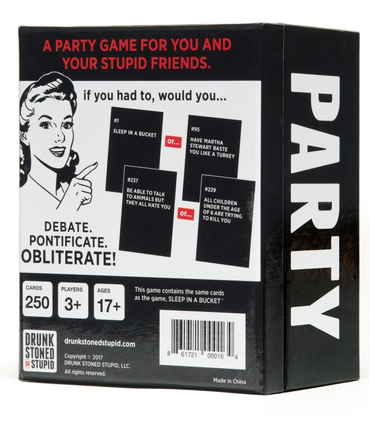 *If you had to, would you rather…?*Play a card from your hand that you think the judge would least want to do. And then it's up to you to make your case and convince the judge that your card is the worst to win point. First one to five points wins – easy.It's very much like a classic game of ‘would you rather’ – only you don't have to spend ages inventing horrible things, because the game already includes 250 hilarious scenario cards.*Features:** 250 game cards with horrible and hilarious scenarios* Just like ‘would you rather’ only you don't have to invent them yourself* Includes classic and alternate rules* The more players the better (seriously, 10 people would be perrrfect)* From the makers of Drunk, Stoned or Stupid