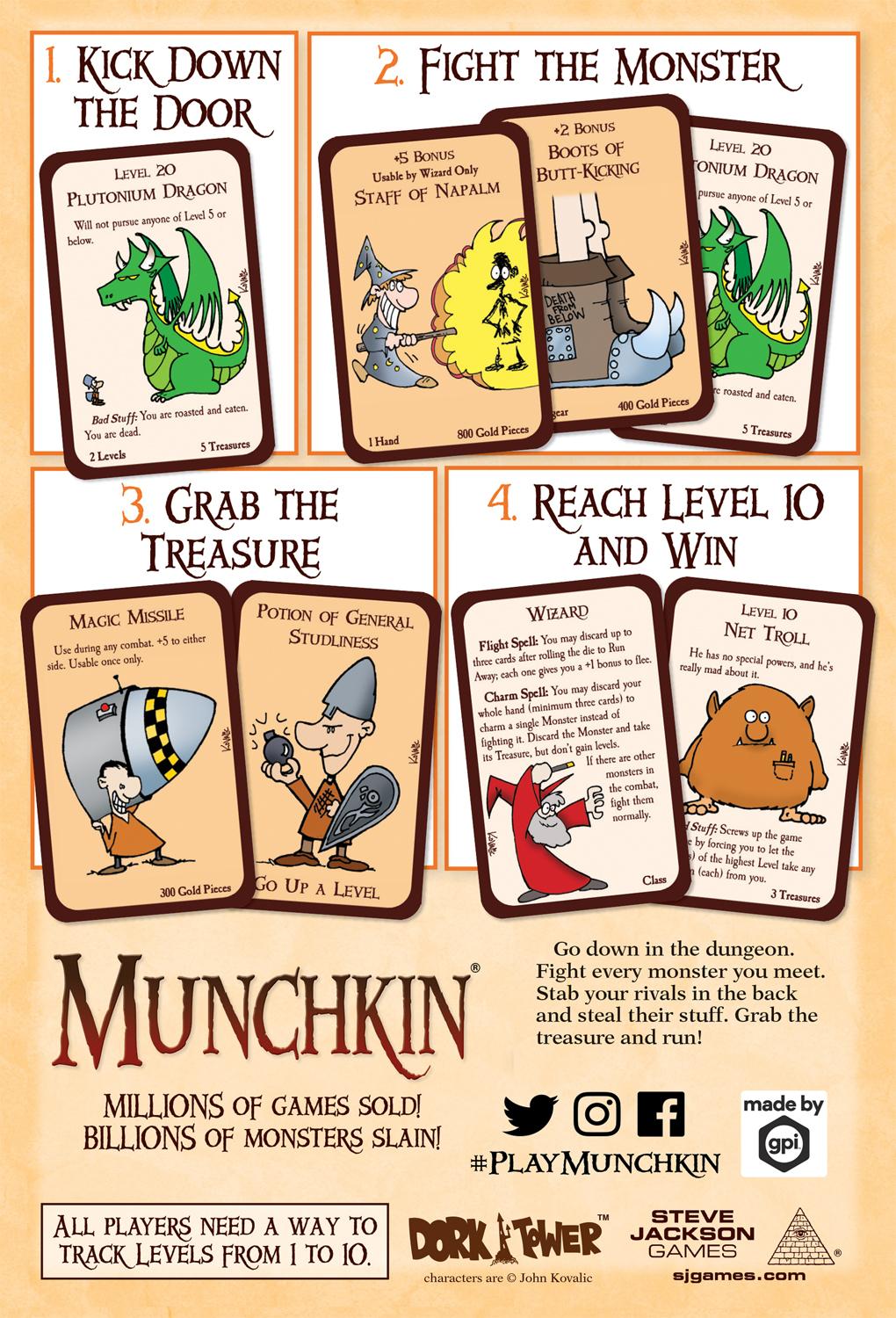Go down in the dungeon. Kill everything you meet. Backstab your friends and steal their stuff. Grab the treasure and run.Admit it. You love it.Munchkin is the mega-hit card game about dungeon adventure . . . with none of that stupid roleplaying stuff. You and your friends compete to kill monsters and grab magic items. And what magic items! Don the Horny Helmet and the Boots of Butt-Kicking. Wield the Staff of Napalm . . . or maybe the Chainsaw of Bloody Dismemberment. Start by slaughtering the Potted Plant and the Drooling Slime, and work your way up to the Plutonium Dragon . . .And it's illustrated by John Kovalic!Fast-playing and silly, Munchkin can reduce any roleplaying group to hysteria. And while they're laughing, you can steal their stuff.