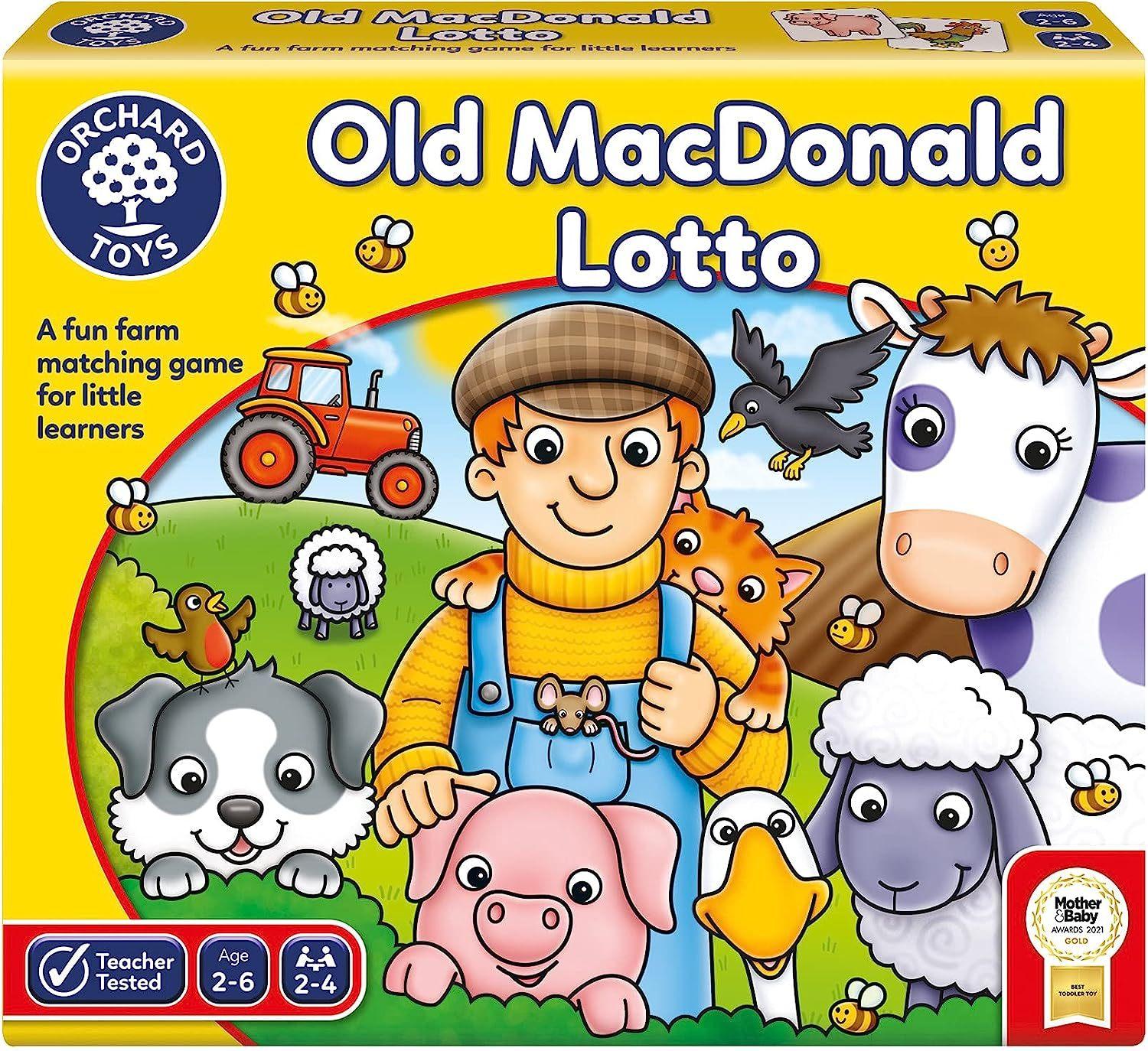 An Old MacDonald twist on the popular Lotto game. Collect all the matching farm tiles from your board to win the game.Players: 2–4.Ages: 2–6 Years.*Orchard Toys:*Orchard Toys is a leading manufacturer of educational puzzles and games for children aged between 18 months and 12 years, with a reputation for excellence of design, manufacture and service.