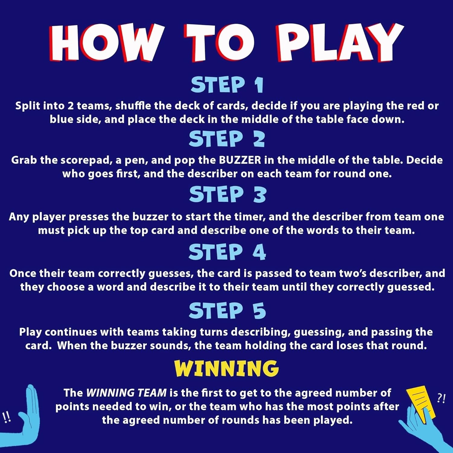 Pick a card – describe a word to your teammates – guess it right –pass the card to the other team – don’t get caught holding the card by therandom timer… tick, tick, tick, tick, BUUUUZZZZ!