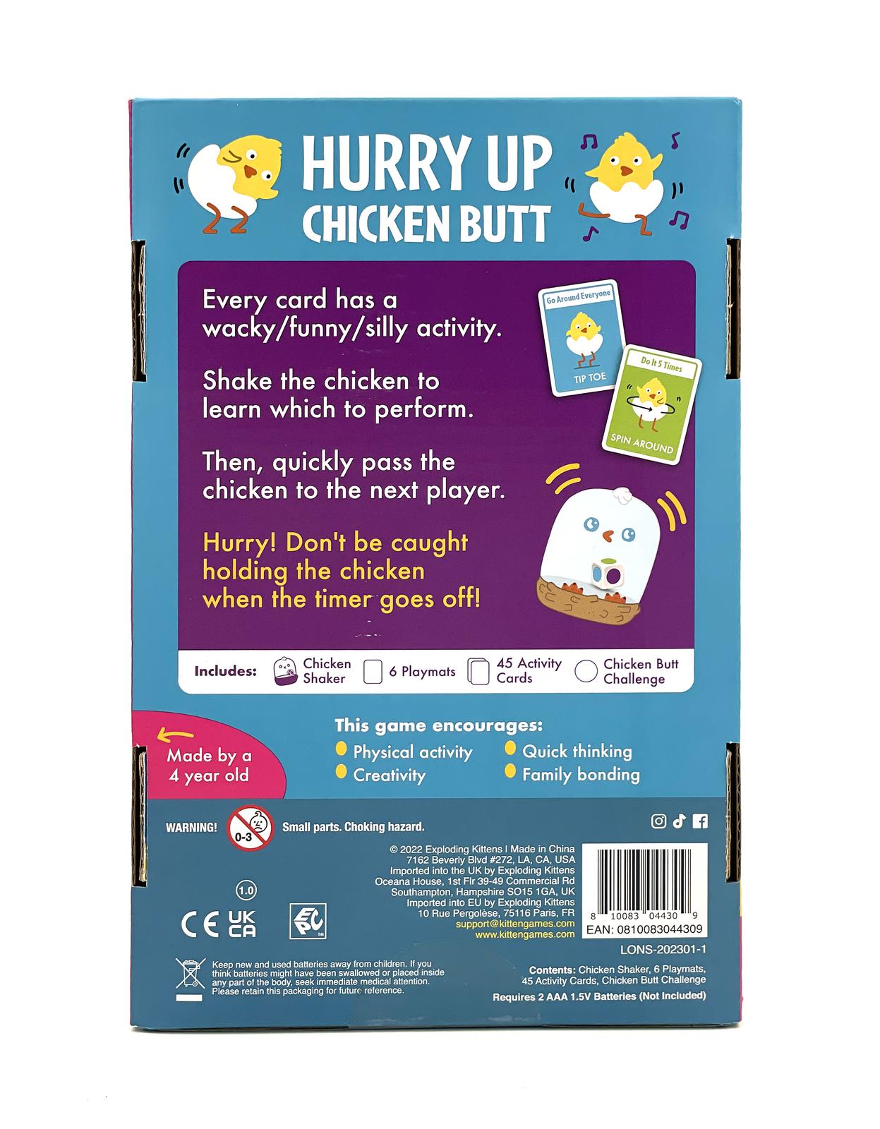 Looking for a quick and hilarious game that the whole family can enjoy? Look no further than Hurry Up Chicken Butt, the frantic physical game from the madcap minds at Exploding Kittens!Suitable for 2–6 players, ages 4 and up, Hurry Up Chicken Butt is a fast and furious game that will have you laughing and shouting in no time. The game is simple – just pass the Chicken Shaker before time runs out – but with 60 physical activity cards to perform before passing the shaker, it's anything but easy.With a dice globe shaker/timer to keep things moving, Hurry Up Chicken Butt is a game of hot potato unlike any other. You'll have to be quick on your feet (and your hands, and your head, and your…) if you want to come out on top. And even if you don't, you'll have a blast trying!So if you're ready for some fast-paced, physical fun that will get everyone moving, grab a copy of Hurry Up Chicken Butt today. You won't let your kids win, but they'll probably beat you anyway – and that's half the fun!