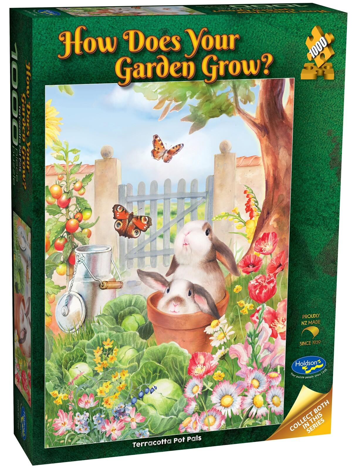 Celebrate the charm of garden life with the How Does Your Garden Grow 500XL jigsaw puzzle series. Featuring the titles: Terracotta Pot Pals with playful rabbits and Sunflower Crate Buddies starring cheerful dogs, each puzzle bursts with vibrant blooms and delightful animal companions.Perfect for puzzle lovers who enjoy heartwarming scenes and larger, easy-to-handle pieces.*Features:** Made in New Zealand by Holdson using vegetable based inks and recyclable materials.* Suitable for ages 8yrs+.* Approximate puzzle dimension: 688 × 498mm.* Approximate puzzle box size: 270 × 370mm.