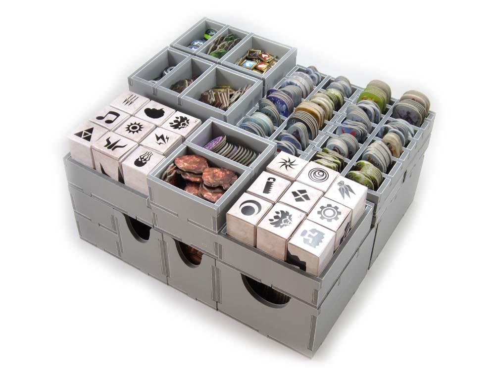 *Note: Gloomhaven Game Components & Box Sold Seperate**Insert designed for games with external box dimensions of 30 × 41.1 × 19­.1 cm.*This insert is designed to be compatible with Gloomhaven®. The design provides both efficient storage and improved game play. Many of the trays can be utilised during the game, and they greatly aid set-up and clear-away times. There is space for all cards to be sleeved. The two monster stat sheet and card trays are designed so that the sheets act as dividers with the monster cards in between. This allows quick access to each monster in game and its relevant cards. These trays also contain the largest monster standees as shown in the image.Gloomhaven® is a big box game with many complex components. The order of placing the insert trays in the box is important to maintain a tight fit for protecting components and also to allow vertical storage. Please follow the sequence of placing trays below. Note that the smaller room tiles stand vertically on the right next to the character boxes.*Insert features:** Two monster standee vertical storage trays* Two medium monster standee trays* Four token trays* Two character mini box trays* Two monster stat sheet and card trays* Four small card vertical storage trays* Two large card vertical storage trays* One coin tray* One stand tray