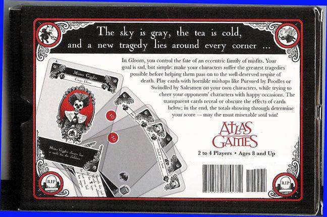 *The sky is gray, the tea is cold, and a new tragedy lies around every corner…**Misery Loves Company: The World of Gloom*When your family is made up of serial killers, crazed circus folk, and demonically possessed sociopaths, misery comes easy. In Gloom, players control these misanthropic misfits. The goal? To make your characters as miserable as possible before allowing them the sweet respite of death. Along the way, you'll make other players' characters horribly happy. Players narrate their characters' misfortunes and mishaps, creating unique stories of suffering in each game. *May the most miserable soul win!**A Sad State of Affairs: Gameplay Basics*In Gloom, each player places negative Modifier cards on their family members to make them delightfully depressed, and positive ones on other players' cards to keep them horribly happy. Untimely Deaths lock in points for good or ill.The award-winning gameplay uses unique transparent cards that stack on top of each other to conceal and reveal the Self-Worth scores from the cards below. The easy scoring and evocative, gloomy art are guaranteed to endlessly entertain players. The game ends when one entire family has shuffled off this mortal coil. The winner is the player with the lowest score, whose family was the most miserable in life!