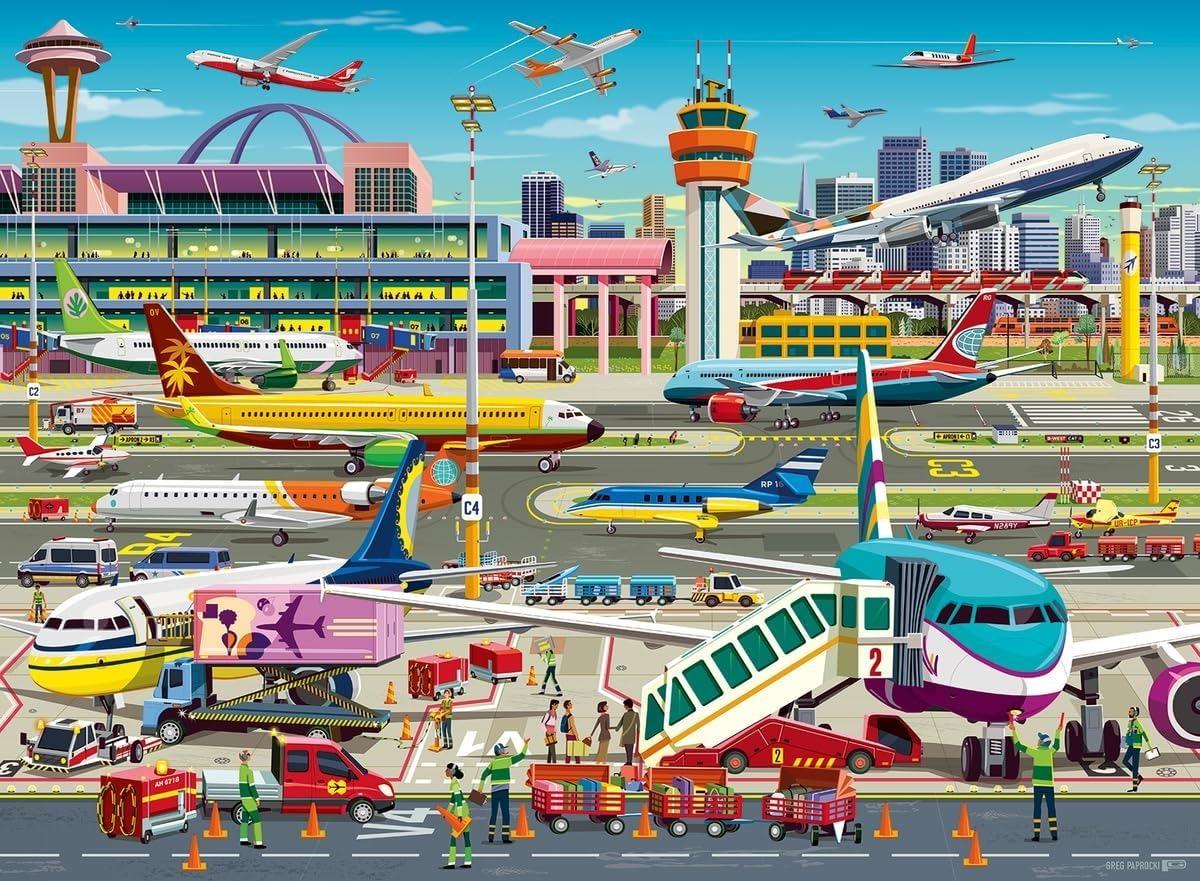 Pilot your child’s imagination sky-high with our “Airport Central” puzzle and watch them fly with this fun illustration by artist Greg Paprocki! Put your child in the pilot’s seat, where they can imagine flying all of these planes — how neat! Our “Airport Central” puzzle shows a very busy place, with planes arriving and departing at a very fast pace. The food service truck is loading a plane with meals for the flight; there’s dinner and breakfast since they’ll fly overnight. Passengers are boarding their plane in a line and are hoping their suitcases make it onboard just fine. A fun puzzle for your future pilot!This 150-piece puzzle has large, durable pieces for lots of repeat fun! Clean-cut pieces and Ravensburger’s tight interlocking fit provide a pleasurable puzzling experience for all. Puzzles help develop hand-eye coordination, fine motor skills and problem-solving through repeated practice. With piece counts children can grow with, our Perfect Age Fit criteria ensure this puzzle is fun and educational for ages 7 and up! About the Artist: A prolific artist, Greg Paprocki always pushes the limits of his imagination. His creativity, drive and careful attention to detail is reflected in his distinctive art. Though he is a one-man shop, Greg’s polished, inventive work evokes the skill set of an entire team of artists, and his talent is evident in the many memorable illustrations he’s created.*Features:** Pilot your child’s imagination sky-high with our “Airport Central” puzzle and watch them fly with this fun illustration by artist Greg Paprocki!* Not just a playtime activity, our puzzle aids in developing problem-solving, dexterity, hand-eye coordination, and concentration skills.A perfect way to inspire creativity and enhance cognitive development.* Made with materials from well-managed forests and recycled materials, this puzzle is as good for the Earth as it is for your family's fun* With over 1 billion puzzles sold worldwide, Ravensburger is the top choice for puzzle enthusiasts of all ages* Whether as a solo activity or as a group fun, puzzles serve as a great gift for all ages. Perfect for birthdays, holidays or simply a day filled with creative fun.