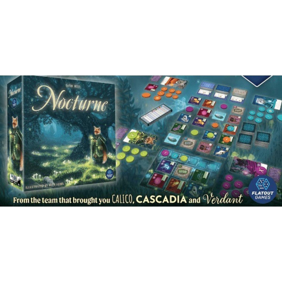 Nocturne is a puzzly spatial bidding and set collection game of sly mystics set in a whimsical moonlit forest illustrated by Beth Sobel!In Nocturne, you play as a fox mystic casting magic spells to collect an assortment of enchanted items. You compete against rival mystics, each of you deciding when to cast the most powerful spells to move through the forest most cunningly to secure the best collection. Each turn you decide which items are most valuable to you and when to hold the other mystics back.Through two rounds (twilight and moonlight), players compete to collect the strongest sets of magical items like firebird feathers, creature skulls, glowing mushrooms, mysterious eggs, and rare herbs. These items have value when collected in specific sets, but can also be combined to fulfill recipes needed for concoctions, scoring you even more prestige!Each round you begin with a set of numbered tokens that represent your spell strengths. These tokens are used to cast spells and bid on a grid of items (and special actions) on the forest floor. Once you cast a spell, your rival mystics will have an opportunity to cast a more powerful spell onto an adjacent item, hoping to compel it towards them and prevent you from collecting what you need! As the forest is explored, different conditions of magical control will restrict pathways, leading to strategic situations in which players can “corner cast” and secure multiple items with less powerful spells. If your spell casting comes up short, you can always make an offering to the forest sprites, magical mice that have their own cache of treasures they may share with you, giving you further options to expand your collection.The set-up of the forest grid and twilight and moonlight goals, along with concoction cards and special player abilities in each game, provide great variability so that no two games of Nocturne will play out the same. Different spatial goals and situations will necessitate different strategies and tactics to outwit your opponents in this highly interactive and unique spatial bidding game!*Features:** 1–4 Players* 30–45mins* Ages 10+