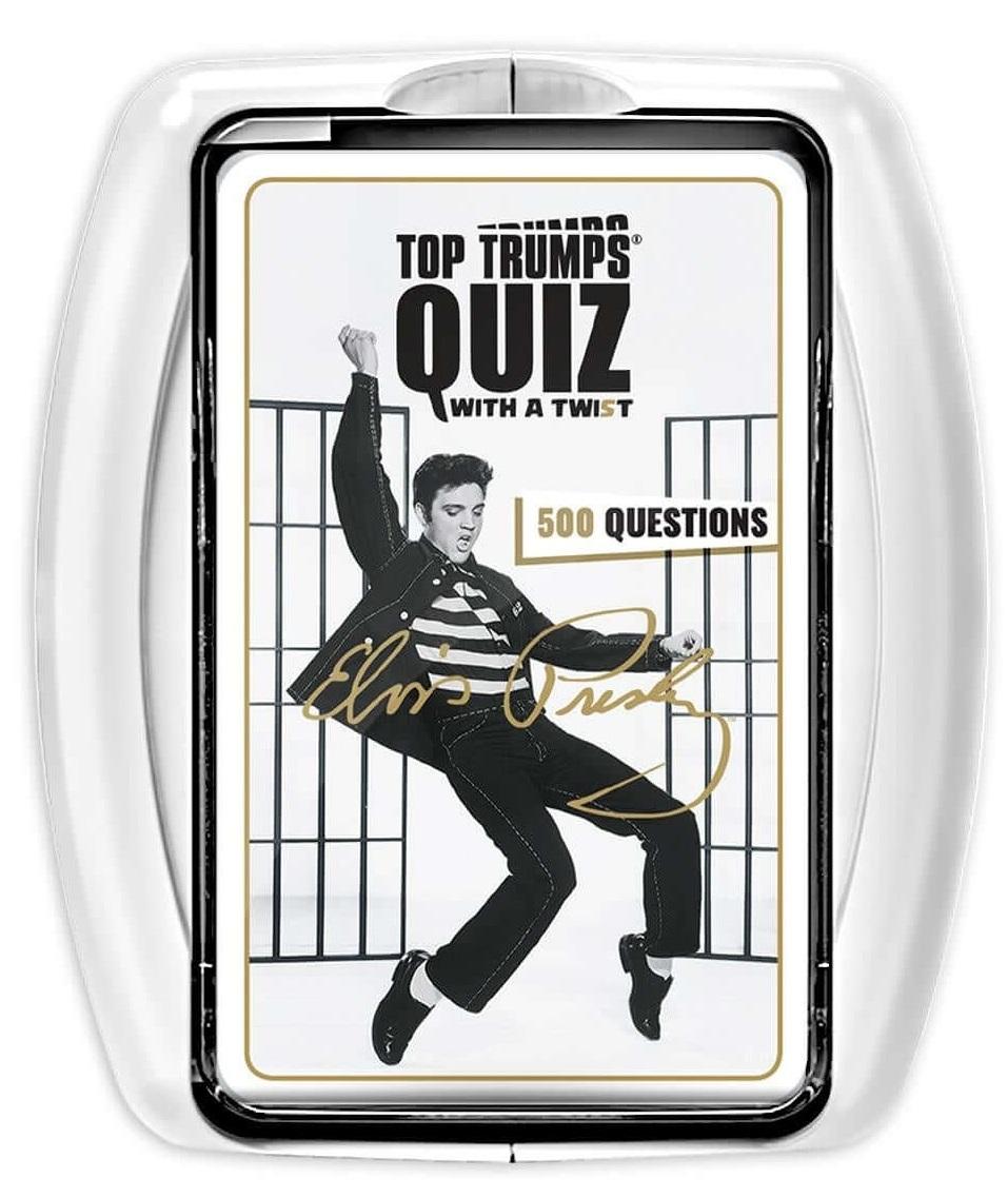 *When he was born on January 8, 1935 in Tupelo, Mississippi, nobody could have guessed that Elvis Aaron Presley would go on to become one of the most celebrated and idolised musicians of his era.*Pioneer of genres such as blues, rockabilly, rhythm and blues, country and, of course, rock and roll. The King of Rock ‘n’ Roll recorded hundreds of tracks in his lifetime and released dozens of albums, and this special edition of TOP TRUMPS QUIZ celebrates and catalogues all of his incredible achievements in trademark TOP TRUMPS style.Featuring 100 question cards with five questions on each card, you will explore categories including lyrics, movies, album names, awards, documentaries and much more besides.Any idea what Elvis’s parents bought him for his 11th birthday? Do you know when he was inducted into the Country Music Hall of Fame? Think you can remember what Elvis’s favourite sandwich was? The King sure was an interesting character, and the truth is often stranger than fiction. But will you be left scratching your head, or dancing the Jailhouse Rock?It’s time to draw a card and find out. Thank you very much!*Key Features:** A little less conversation and and a little more question – only with TOP TRUMPS QUIZ!* Entertaining, educational card game revisits the life and legacy of the King of Rock ‘n’ Roll* 500 rhythmic, rockabilly questions that will get your knowledge and memory all shook up!* Easy-to-carry plastic case means there are no limits on gameplay.* Prepare to outsmart your opponents, discover new and exciting blues facts and rock your way to becoming the Top Trump*Specifications:** *_Product Dimensions:_* 110mm x120mm x80mm* *_Suitable Age:_* 3+* *_Number of Players:_* 2+