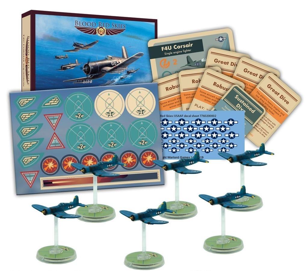 *Blood Red Skies F4U Corsair Squadron*The F4U flew over 60,000 operational sorties (only 9,000 sorties flown from carrier decks) for the U.S. Navy & Marines and U.S. Navy through the war (some 40% of total fighter sorties), with only 9,581 sorties (15%) flown from carrier decks. Corsairs claimed 2,140 air combat victories against 189 losses to enemy aircraft, for an overall kill ratio of over 11:1. It also proved its versatility, delivering over 70% of the total bombs dropped by U.S. fighters during the war.This set gives you all you need to field a squadron of the F4U Corsair in your games of Blood Red Skies!*Including:** 6× metal F4U Corsair’s* Generic US waterslide Decals Sheet* Aircraft Cards* Aircraft Trait cards* Double-sided Pilot Skills Discs* Advantage Flying bases