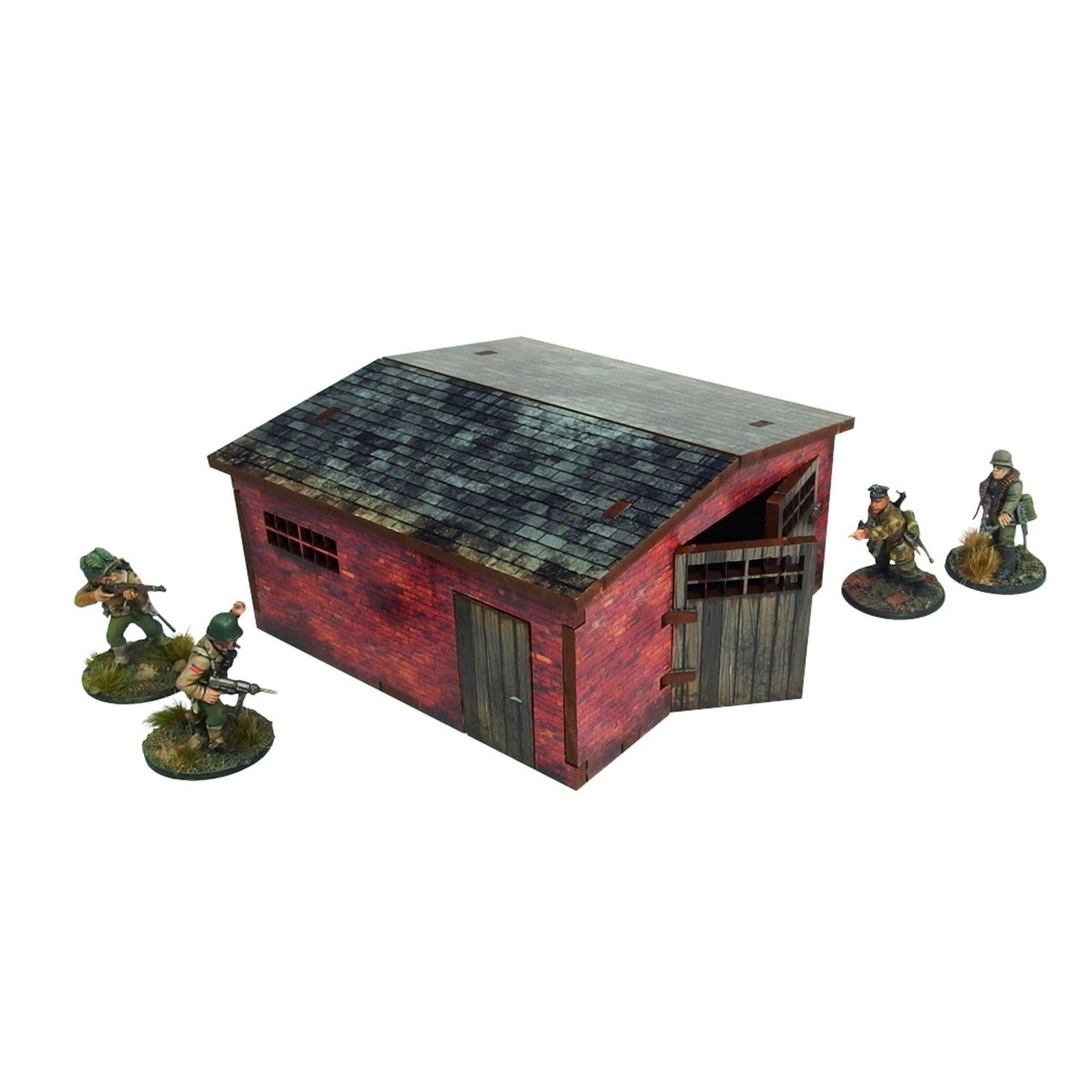 Multicolor prepainted (UV-printed) single level WW2 Normandy Large Brick Shed building with accessible colorful interior and removable roof. Option to assemble with open or closed doors. The gate can be opened or closed during play. Room to fit in a small vehicle or medium infantry squad inside.*Specifications:** Length: 10cm / 3,9in* Width: 10cm / 3,9in* Height: 5,5cm / 2,2in* Scale: 28–30mm / 1:56This model is delivered as a pack, unassembled and PREPAINTED.Every model is cut from one or more panels of HDF (high-density fiberboard) of 3mm and/or 1,5mm thickness.WW2 series scenery might prove demanding to assemble, dry fit parts before applying the glue to avoid mistakes. PVA (white) glue is recommended._Please Note: Before taking the elements out make sure they are fully cut. There are minor connections that prevent them from falling out. Parts are secured with a layer of protection paper, please remove it gently before assembly. Tiny paint chips may occur when removing the protective layer, if it happens so, use color marker or hobby paint to mask them.__Please Note: Miniatures are not included – used for scale only._