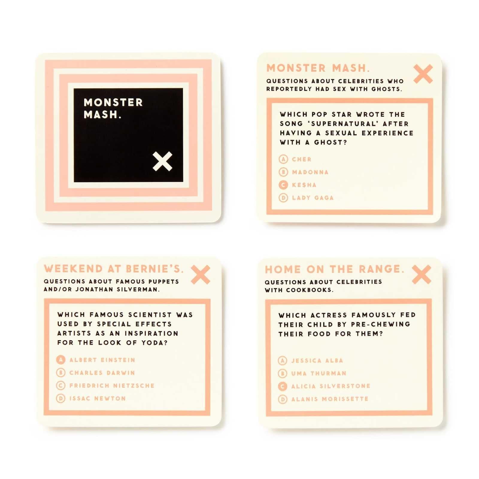 Trivia should be fun – not feel like a homework assignment. That’s why we’ve filled ours with as many completely useless celebrity facts as we could find…and even better, you’ll choose questions from a bunch of misleading categories. For example: “You’ve Got Mail” – which are questions about celebrities who still use an AOL email account.Suitable for 2 to 8 (or more) players.*Features:** Includes 200 unique trivia cards specifically themed around celebrities.* Includes an instruction sheet with 3 different ways to play (depending on how smart you think you are).* Each two-sided card measures 3” wide by 2.8” tall (76mm x 71mm).* The box measures 3.5” square by 3” deep (89mm x 89mm x 76mm).