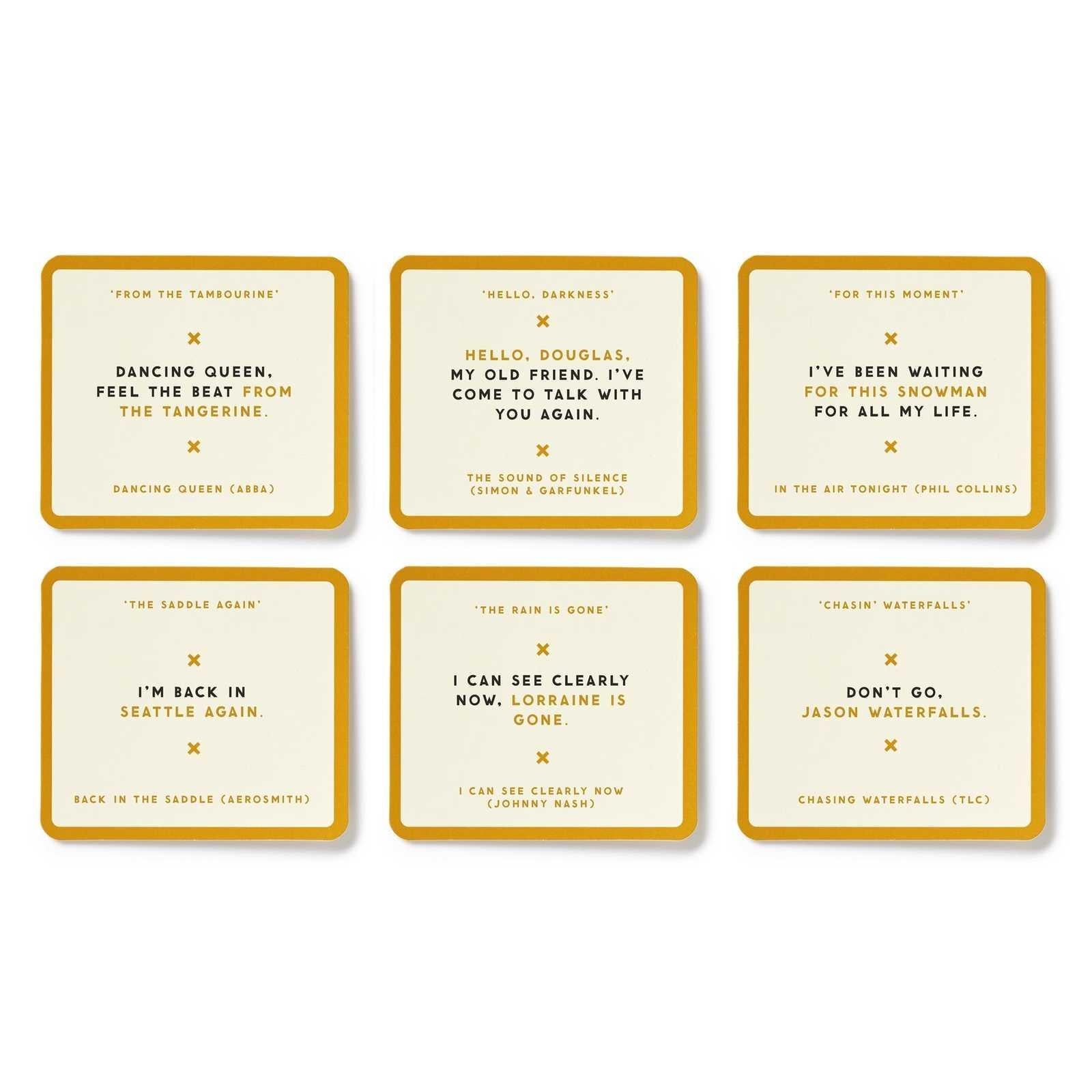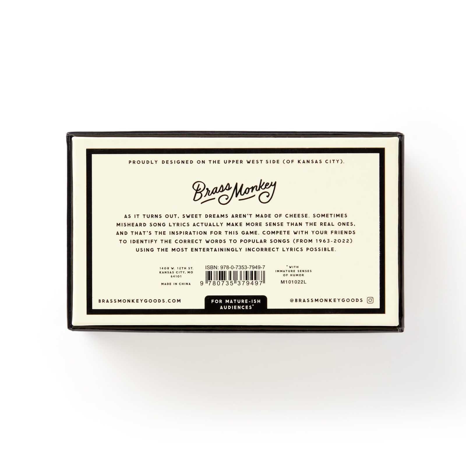 A party game all about identifying songs–from the most wildly incorrect lyrics possible. As it turns out, sweet dreams aren’t actually made of cheese. Sometimes misheard song lyrics actually make more sense than the real ones–and that’s the inspiration for this game. Compete with your friends to identify popular songs from the most entertainingly incorrect lyrics possible. For example: ‘I’ve got two chickens to paralyze.’ Psst, it’s ‘Two Tickets to Paradise’ by Eddie Money.*Features:** Includes 300 game cards–each featuring uniquely-incorrect lyrics to a song.* Includes instructions for two distinct ways to play (competitive & casual).* Suitable for 2 to 8 players.* The outer box measures 5” x 2.8” tall x 3” deep (127mm x 71mm x 76mm).* Game cards measure 2.472" x 2.8" (63 mm x 71mm).